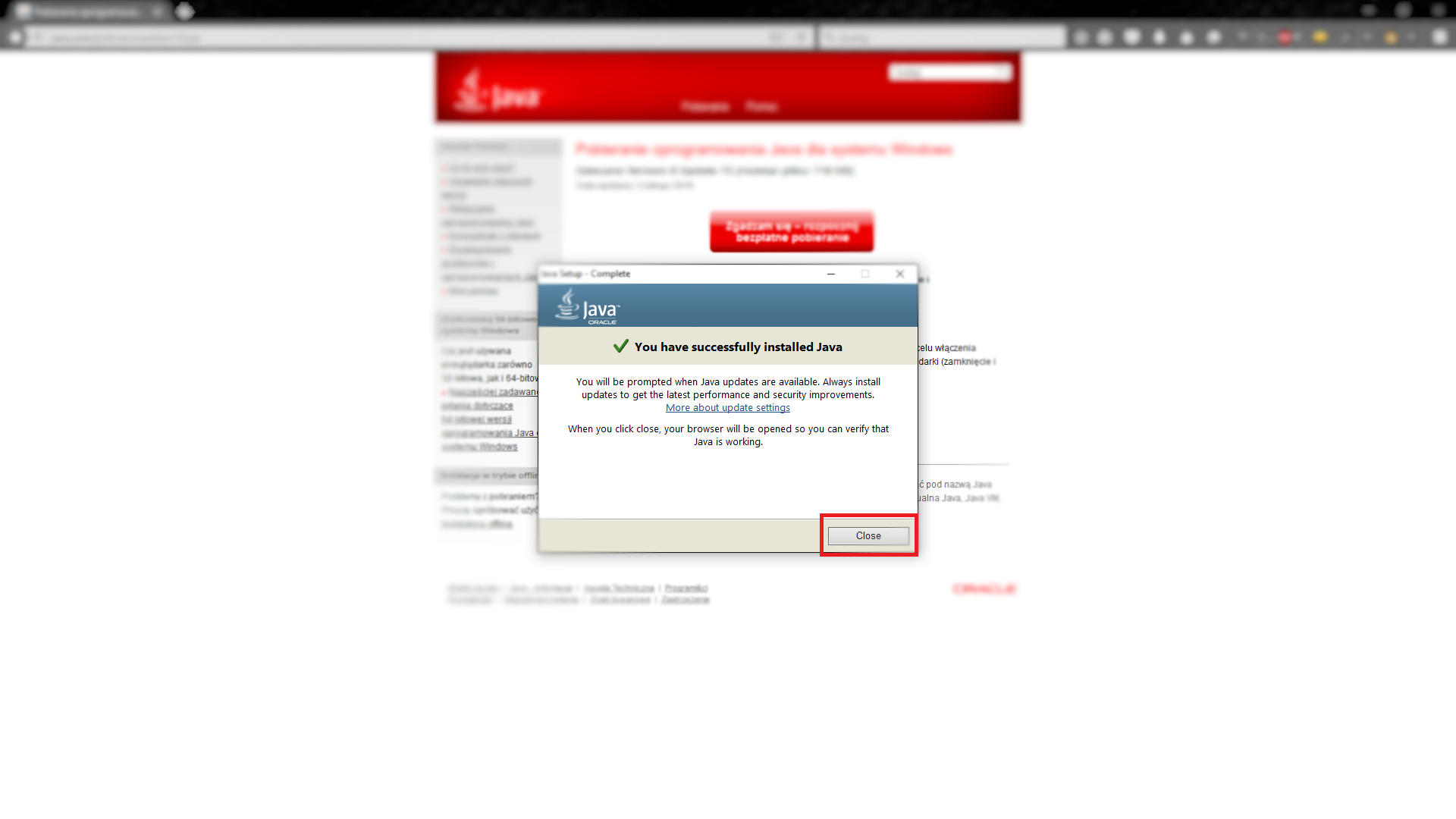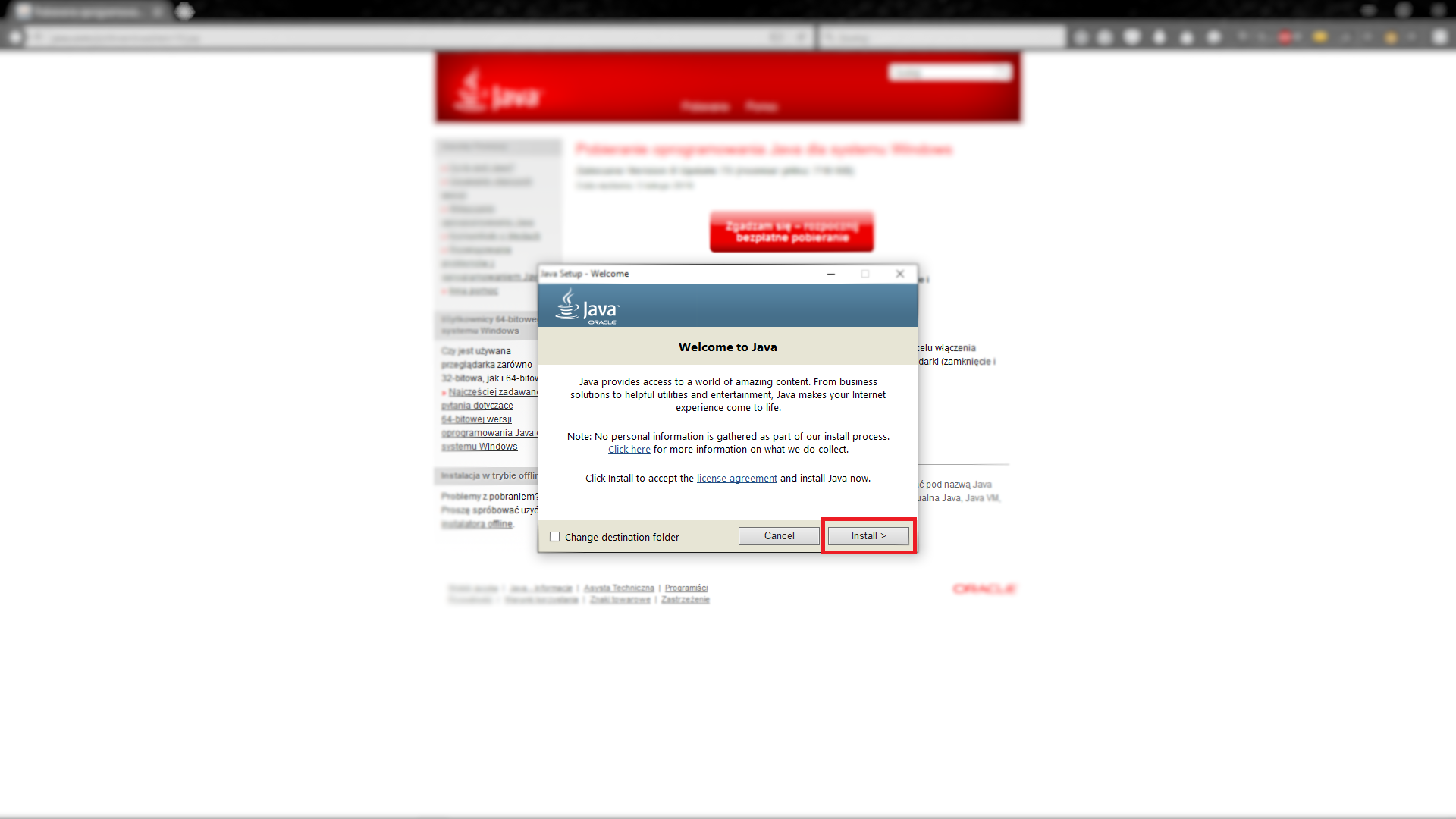 Klikamy na "Przejdź do bezpłatnej instalacji najnowszej wersji JAVA"