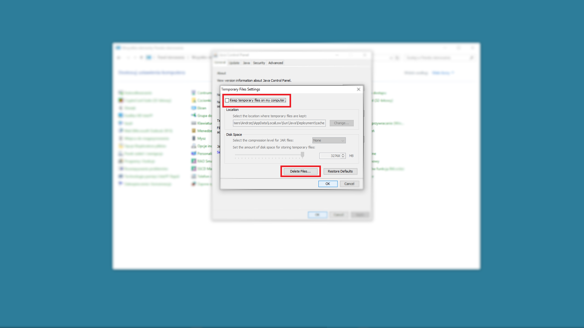 W okienku JAVA CONTROL PANEL w zakładce GENERAL wybieramy SETTINGS
