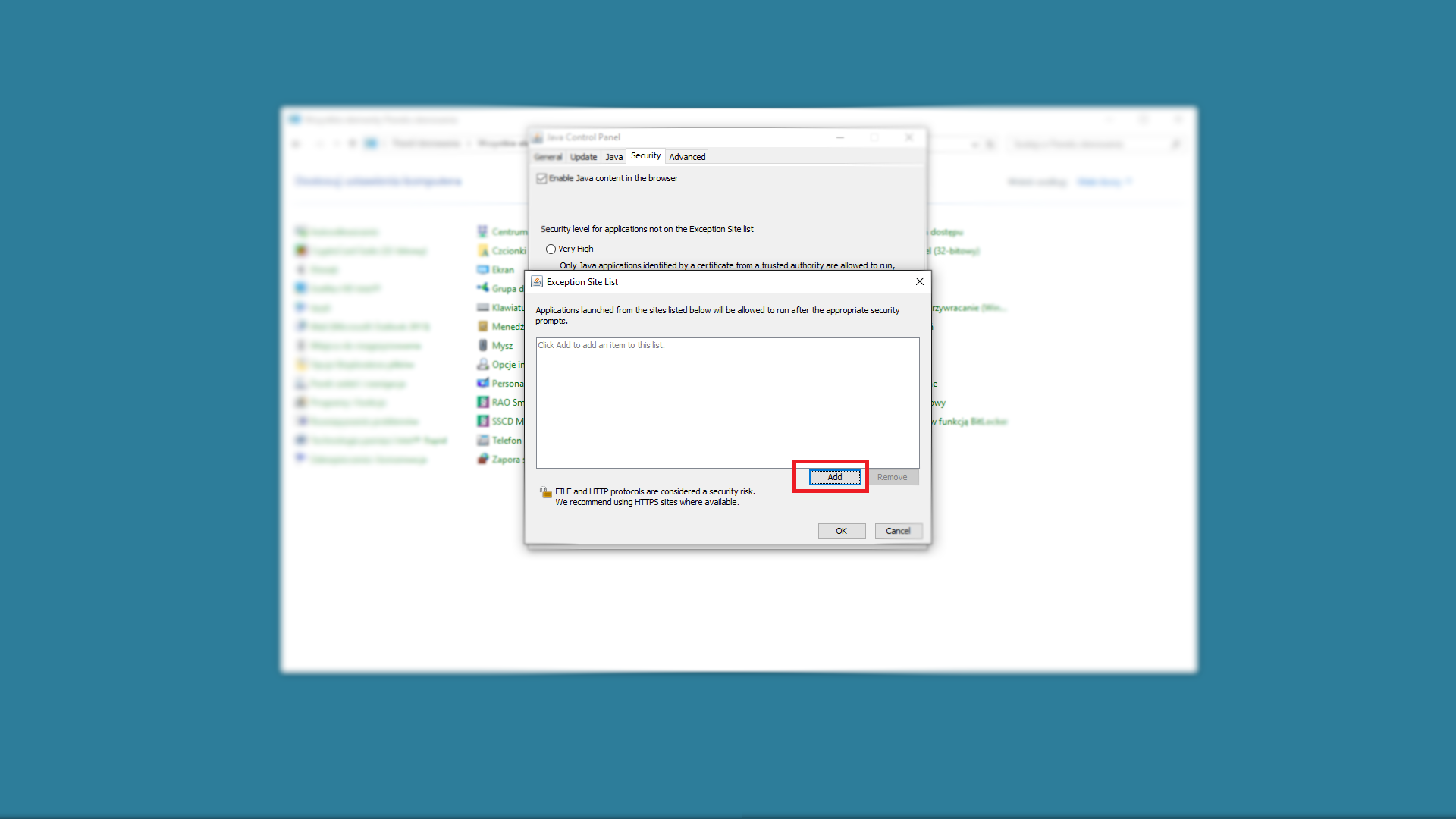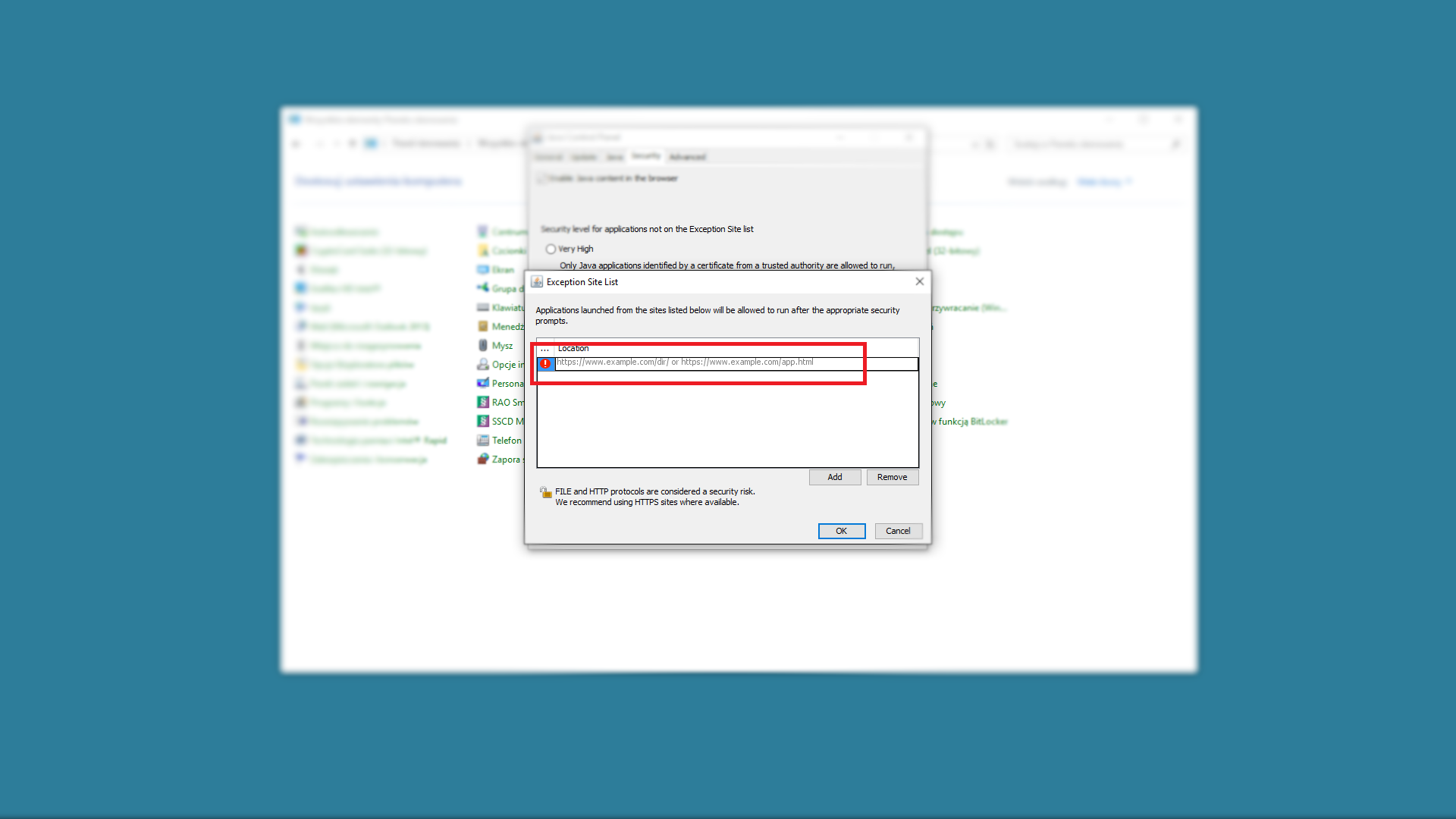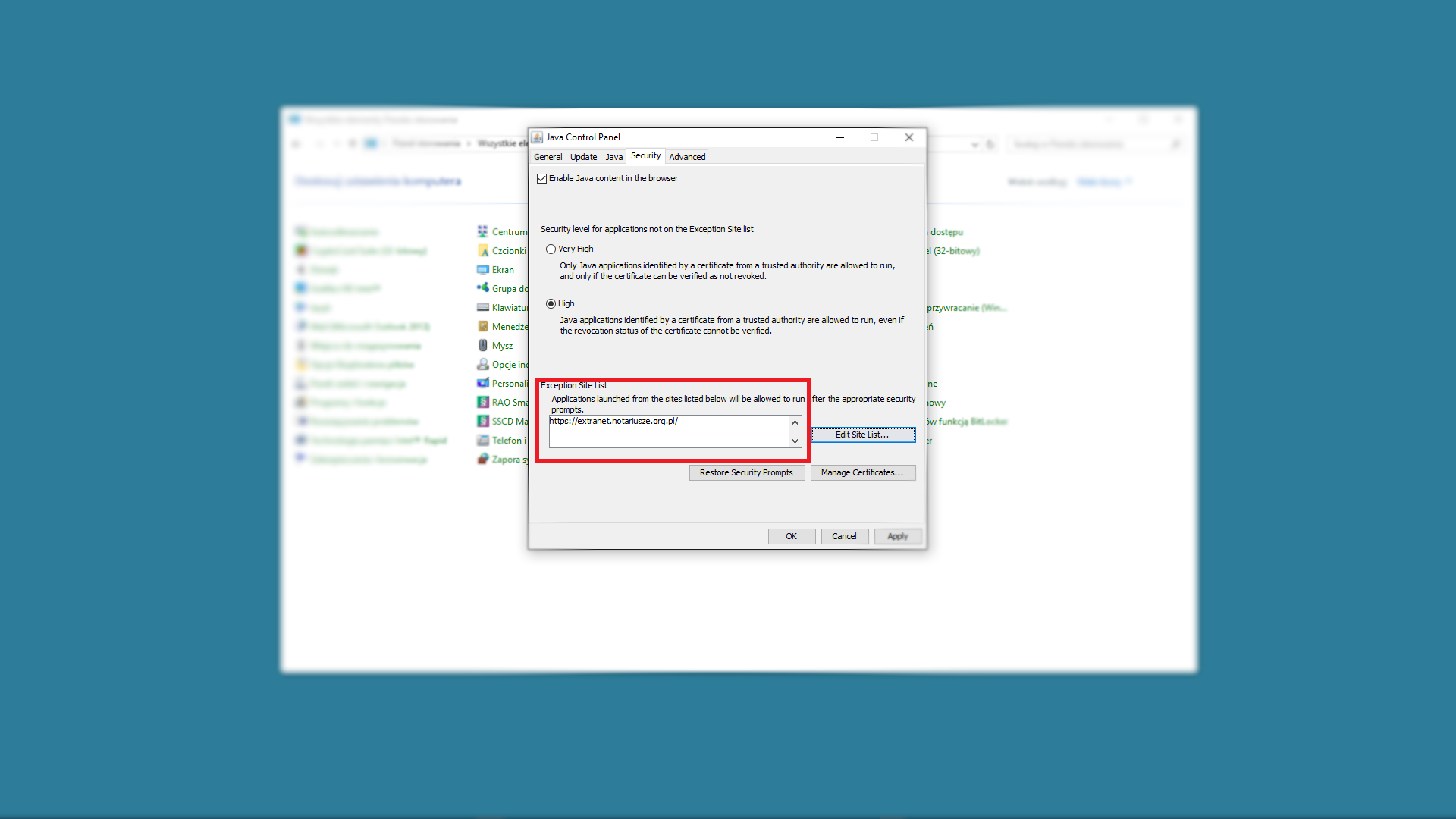 W takim przypadku należy dodać pełny adres extranetu do listy wyjątków JAVA. Pełny adres to https://extranet.notariusze.org.pl/ Należy pamiętać o ukośniku na końcu oraz przedrostku HTTPS.