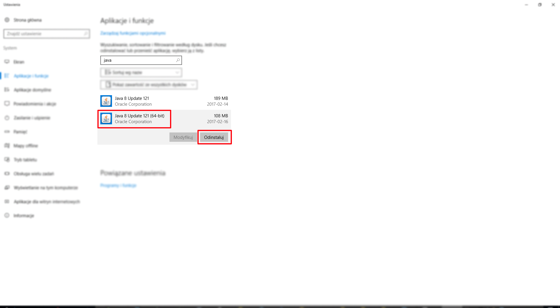 Odszukujemy pozycję JAVA lub JAVA (32-bitowy)