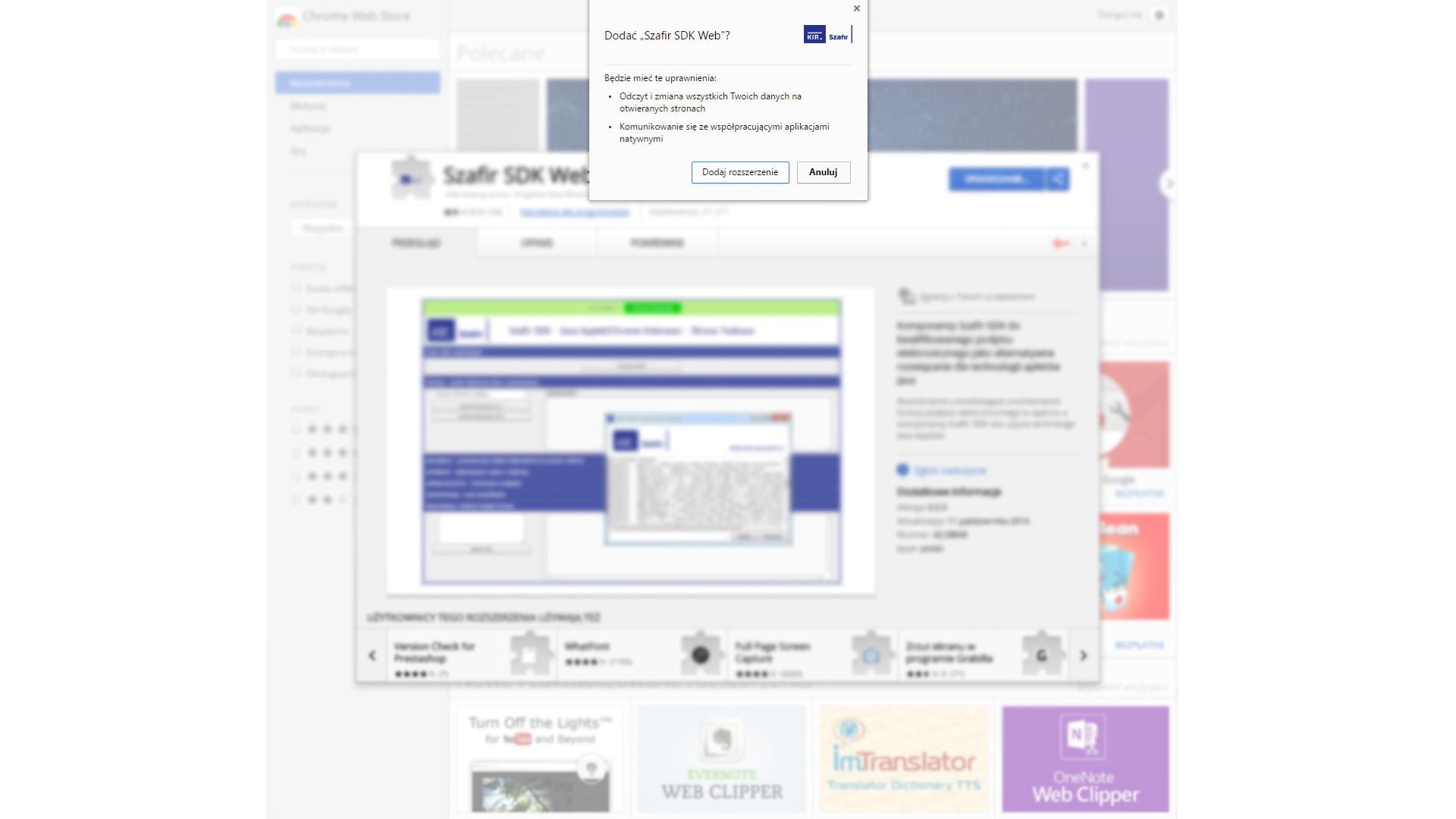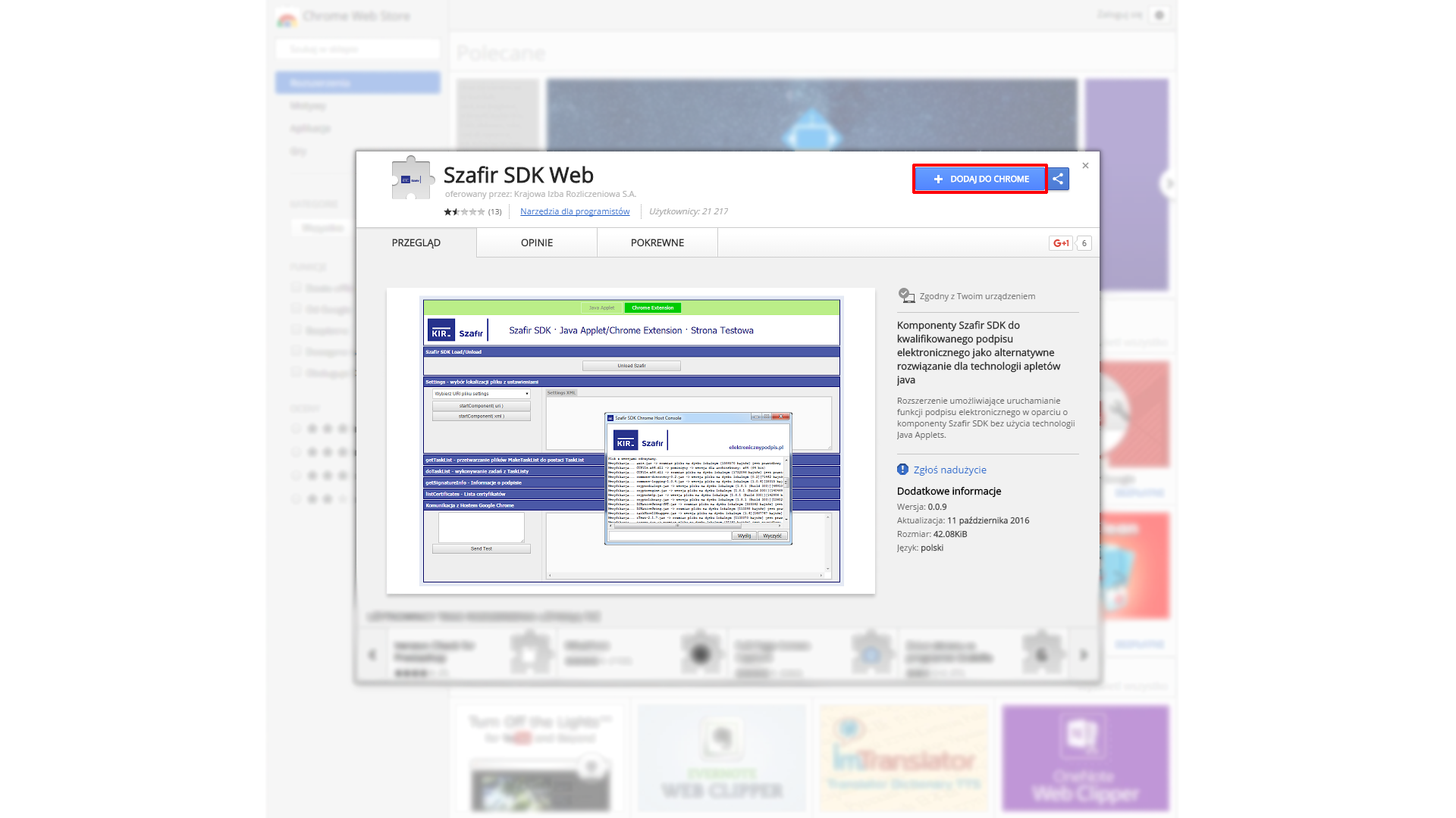 W przypadku komunikatu o braku zainstalowanego rozszerzenia Szafir SDK, należy je zainstalować klikając na przycisk "Instalacja rozszerzenia z Web Store":
