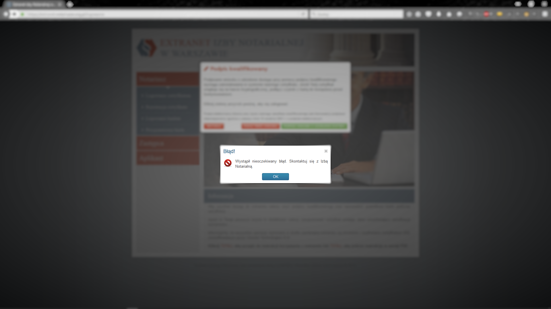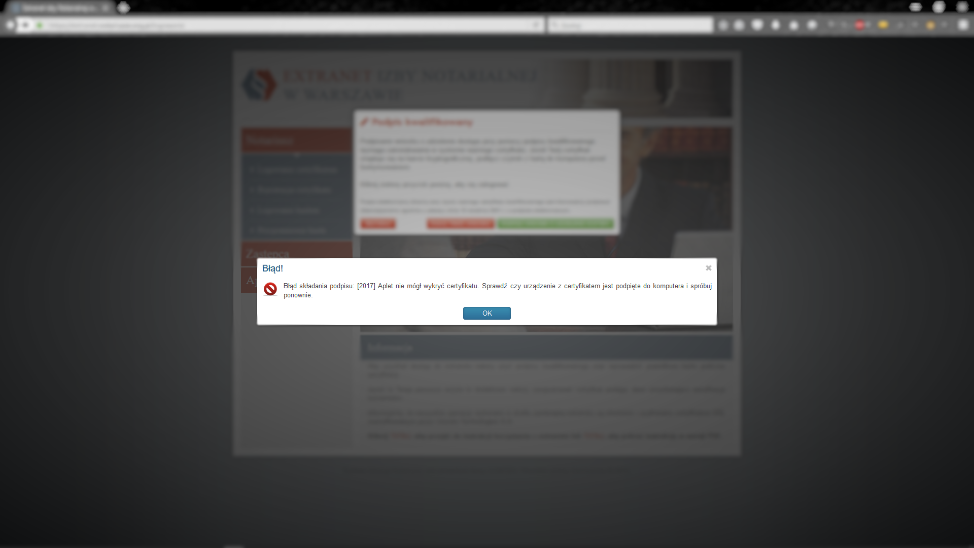 Poniższe zdjęcia zaprezentują rozwiązania problemów związanych z wykorzystaniem podpisu kwalifikowanego do logowania w extranecie. Ze względu na różnorodność przeglądarek niektóre z plansz mogą ukazywać elementy delikatnie różniące się od tych na Państwa komputerze. Należy również pamiętać, aby utrzymywać przeglądarkę jak również inne komponenty aktualne. Nieaktualna przeglądarka i/lub komponenty mogą powodować utrudnienia lub uniemożliwią korzystanie z extranetu.